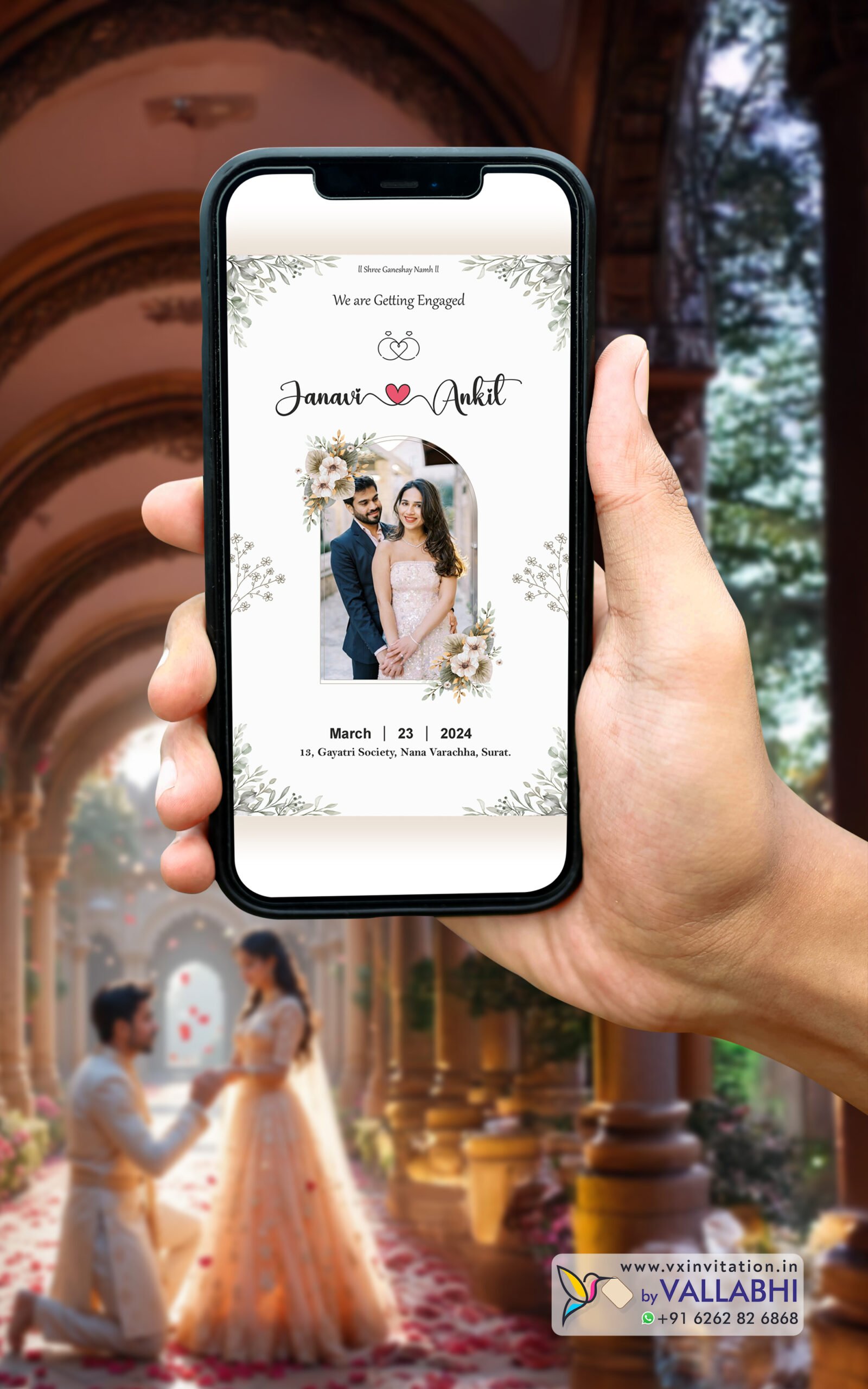 Celebrate love and togetherness with Vallabhi’s Floral Frame Engagement Invitation, designed with soft greenery, elegant floral frames, and a photo-centered layout.