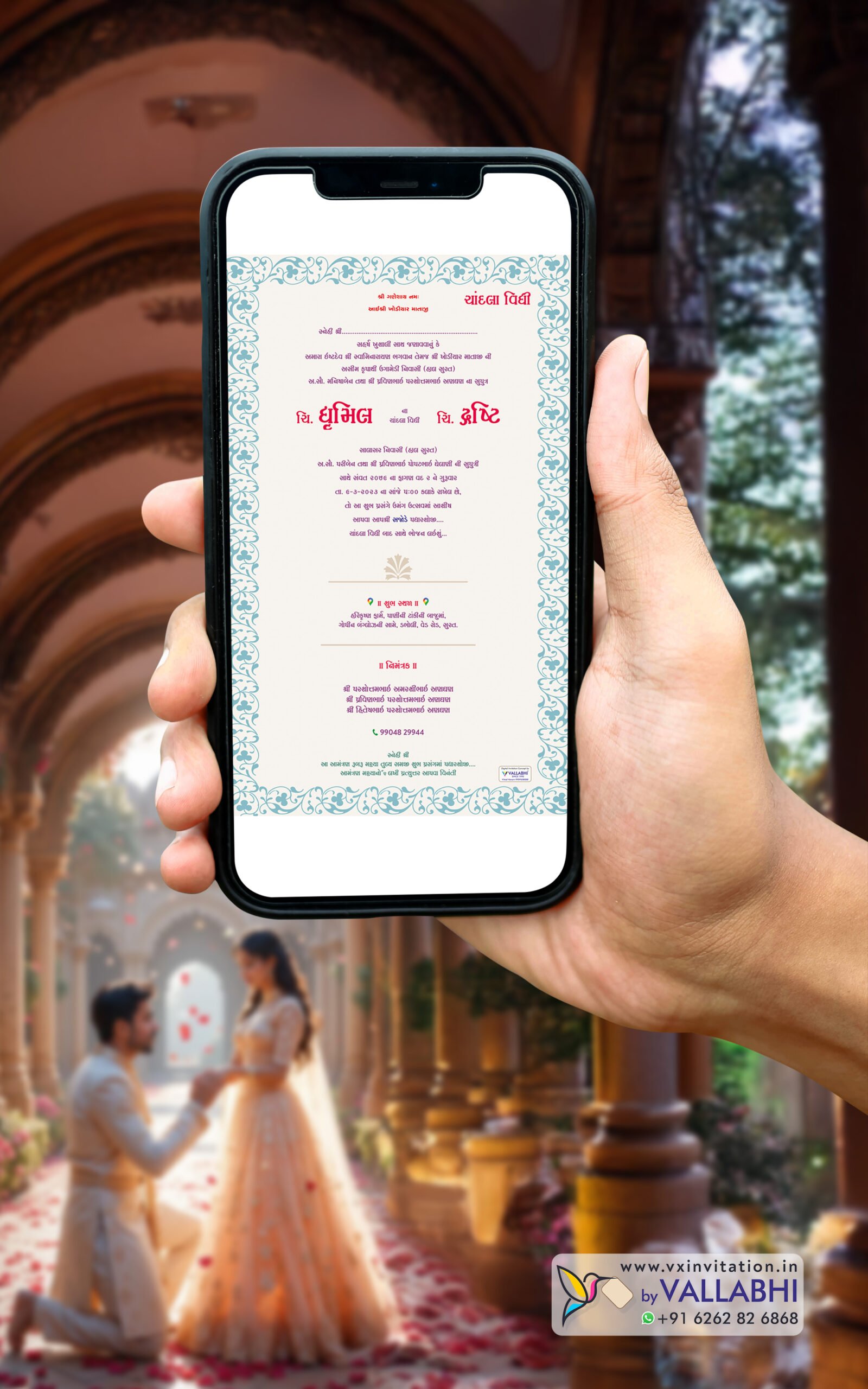 Invite your loved ones with grace through Vallabhi’s Classic Engagement Digital Invitation, featuring clickable location, call-to-connect option, and elegant blue ornamental borders — a perfect mix of traditional style and modern digital convenience.