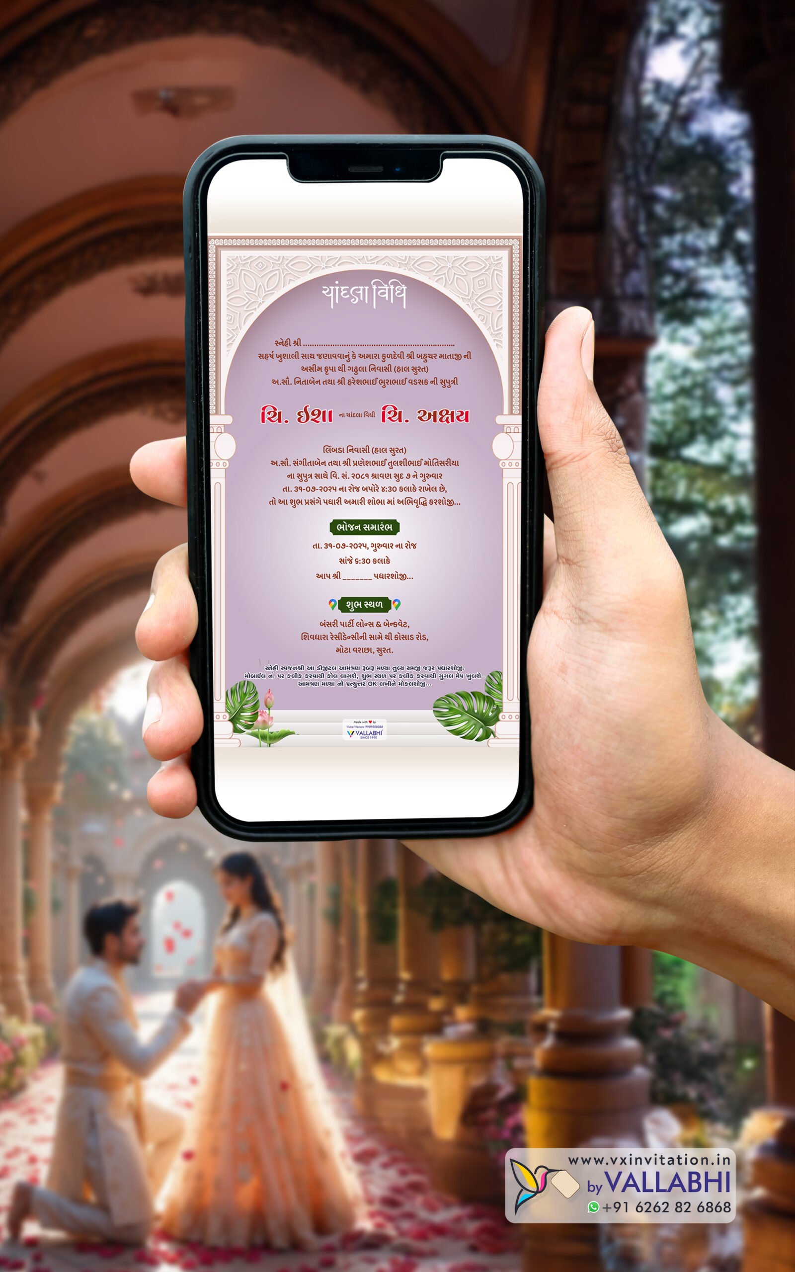 A perfect fusion of classic elegance and modern technology — featuring royal arches, pastel curtains, and clickable smart features like location and one-tap calling, all designed with premium fonts and HD quality.