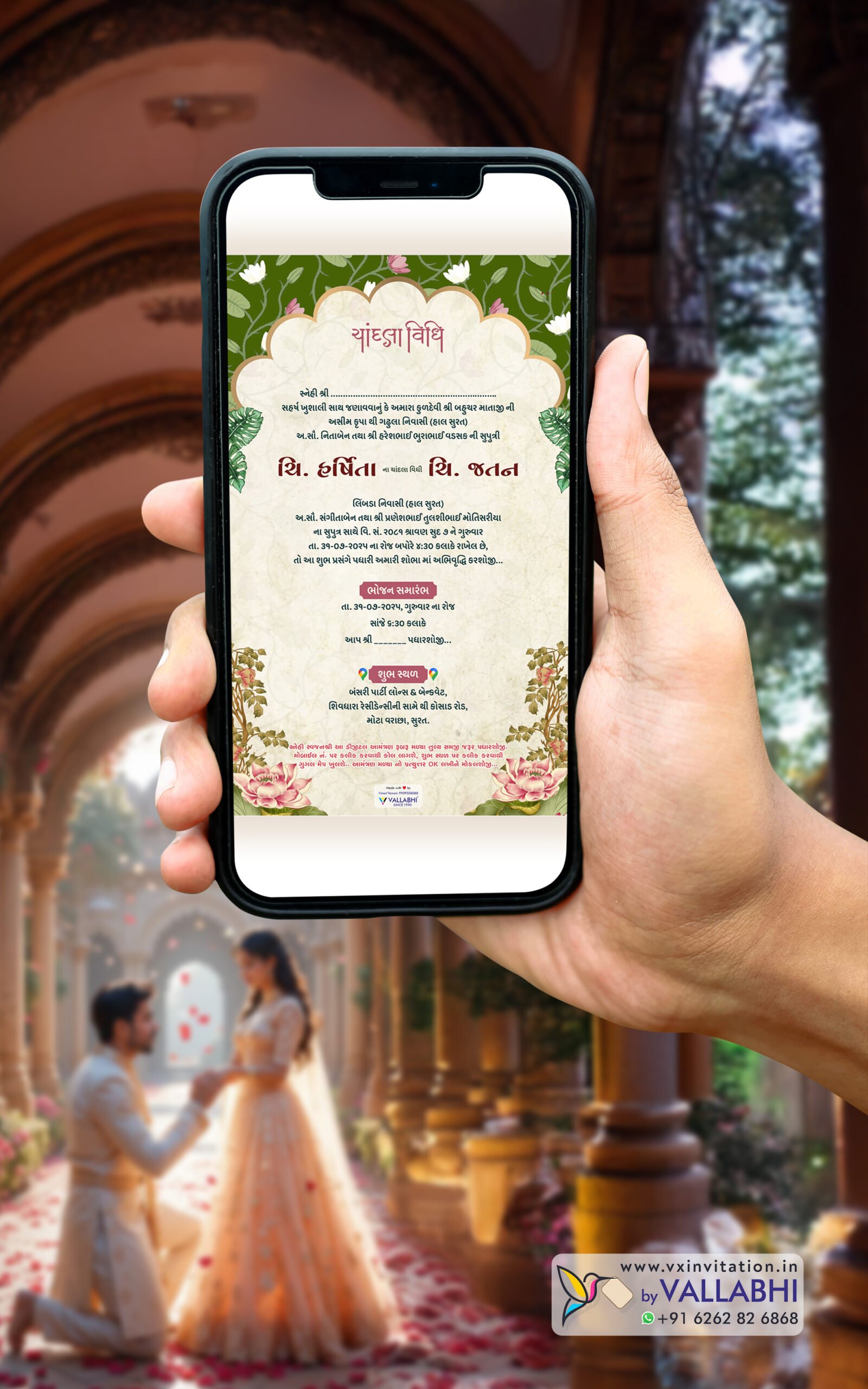 Invite your guests with the serenity of nature and the grace of tradition. Vallabhi’s Lotus Green Digital Invitation blends soft botanical motifs, elegant lotus art, and premium fonts to create a refreshing, royal feel. Includes clickable location, click-to-call, and the latest design layout for a perfect digital experience.