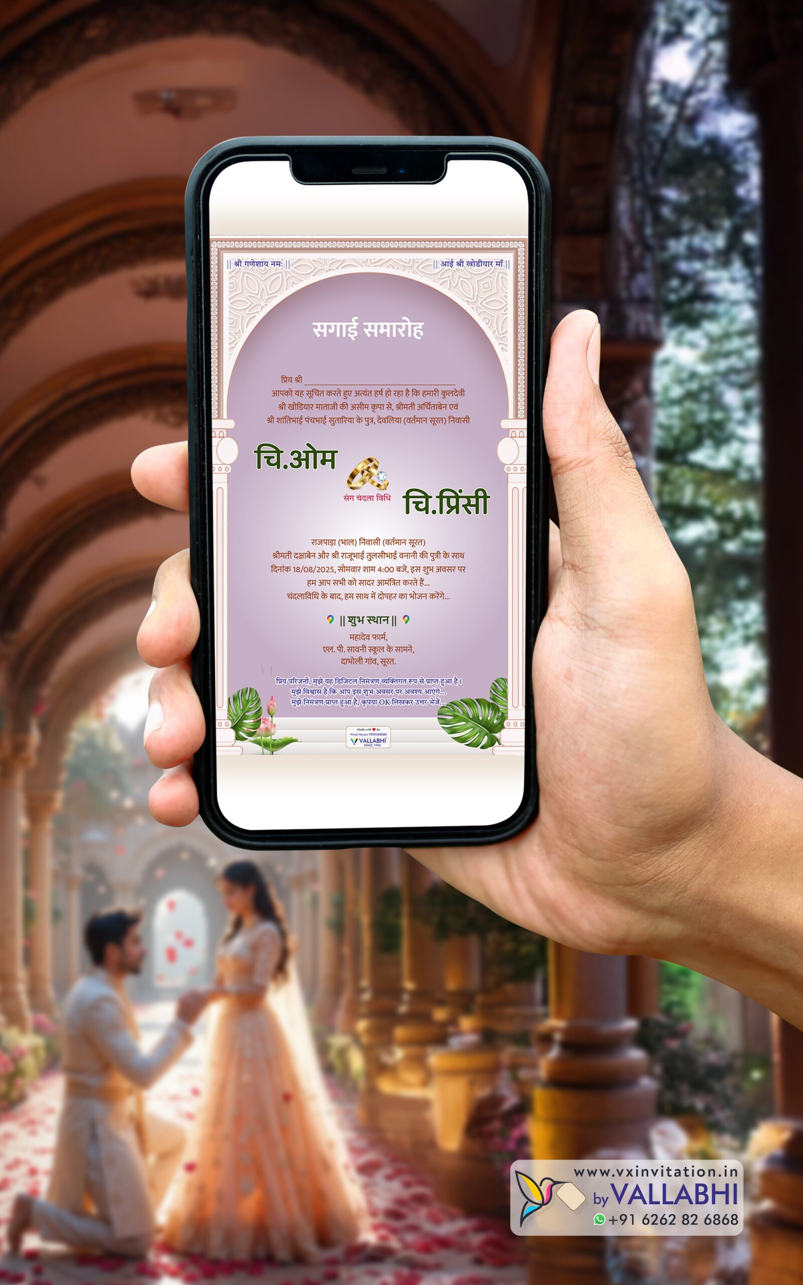 Featuring elegant lavender tones, intricate arch patterns, and regal drapery effects — this digital card comes with clickable location, click-to-call mobile number, premium fonts, and the latest sophisticated design that beautifully blends modern and traditional artistry.