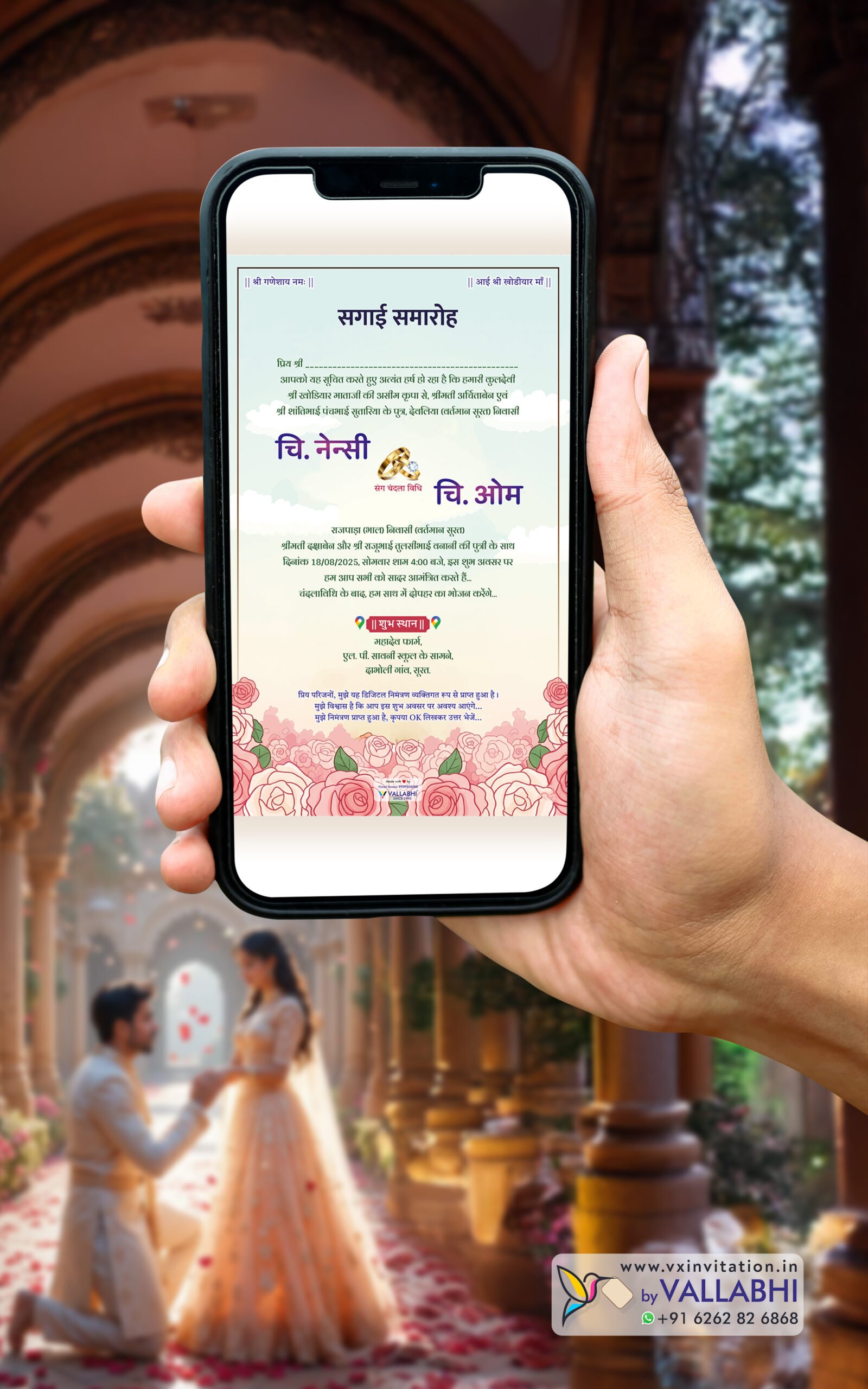 Featuring a pastel rose-themed background and a charming illustrated couple, this elegant e-invite includes clickable location, click-to-call mobile number, premium fonts, and a fresh, modern design perfect for engagement events.