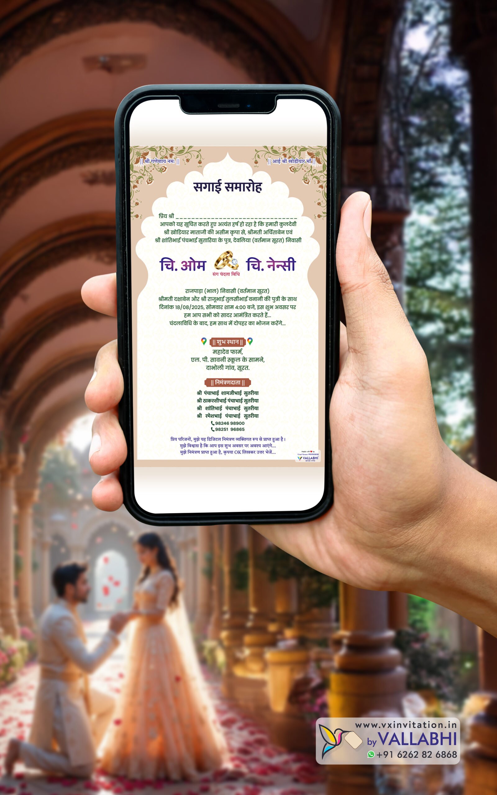 With soft beige tones, intricate patterns, and a beautifully illustrated couple, this digital invitation is designed with clickable location, click-to-call mobile number, premium fonts, and the latest designer layout for a refined, royal celebration.