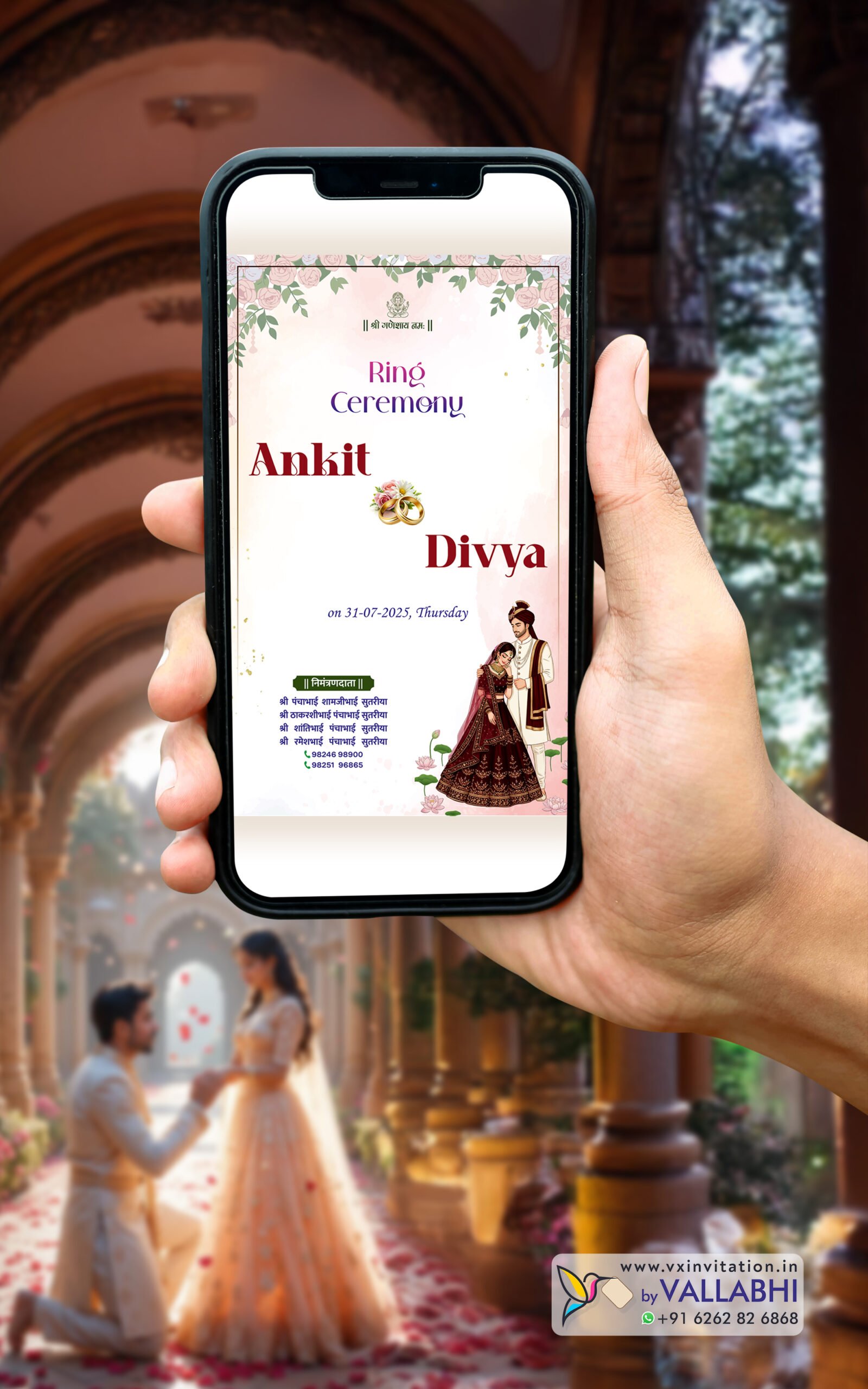 Comes with clickable location, click-to-call mobile number, premium fonts, and the latest designer look—perfect for your special engagement day.